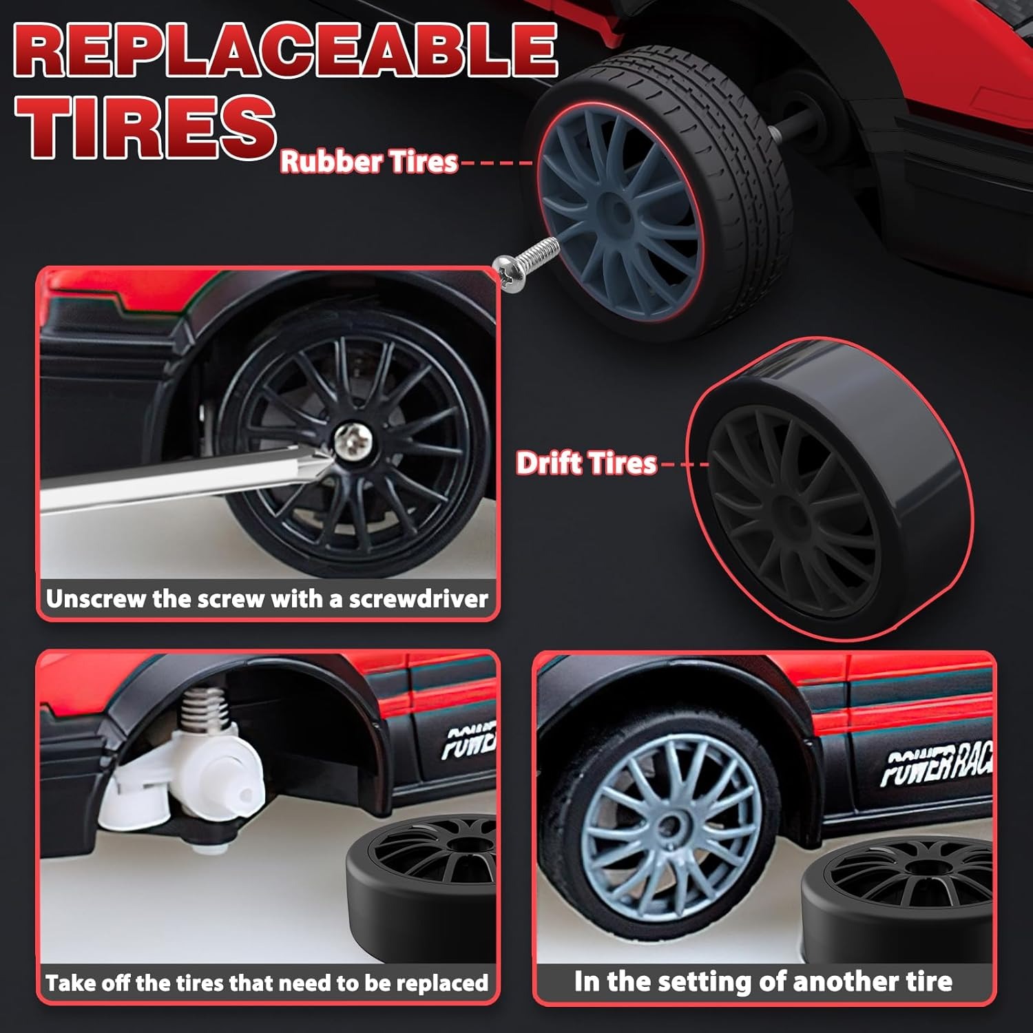 Sus neumáticos intercambiables te permiten cambiar entre carrera y drifting en segundos.