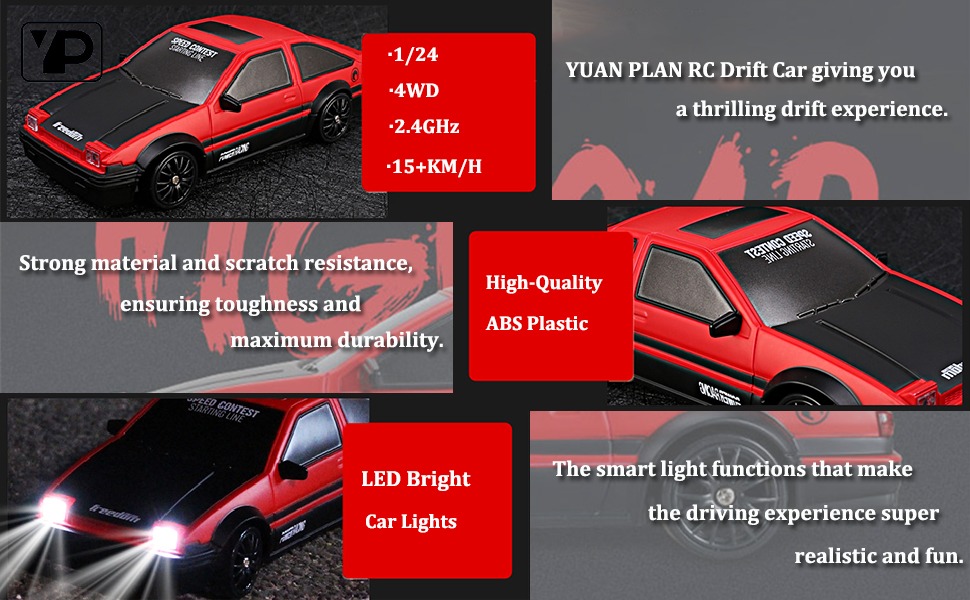 Coche RC Drift 1:24, 2.4GHz 4WD, alta velocidad 15 km/h, luces LED y neumáticos drifting
