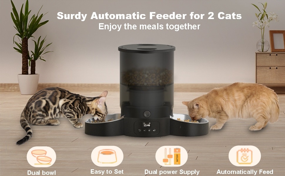 El comedero automático Surdy distribuye la comida de forma uniforme en ambos compartimentos, garantizando que tus gatos reciban porciones idénticas sin generar rivalidad. Su sistema de doble canal evita la alimentación desigual y promueve la convivencia pacífica entre tus mascotas. Además, puedes programar entre 1 y 6 comidas diarias, ajustando de 1 a 12 porciones por comida, lo que te permite mantener una dieta equilibrada y controlar el peso de tus felinos.