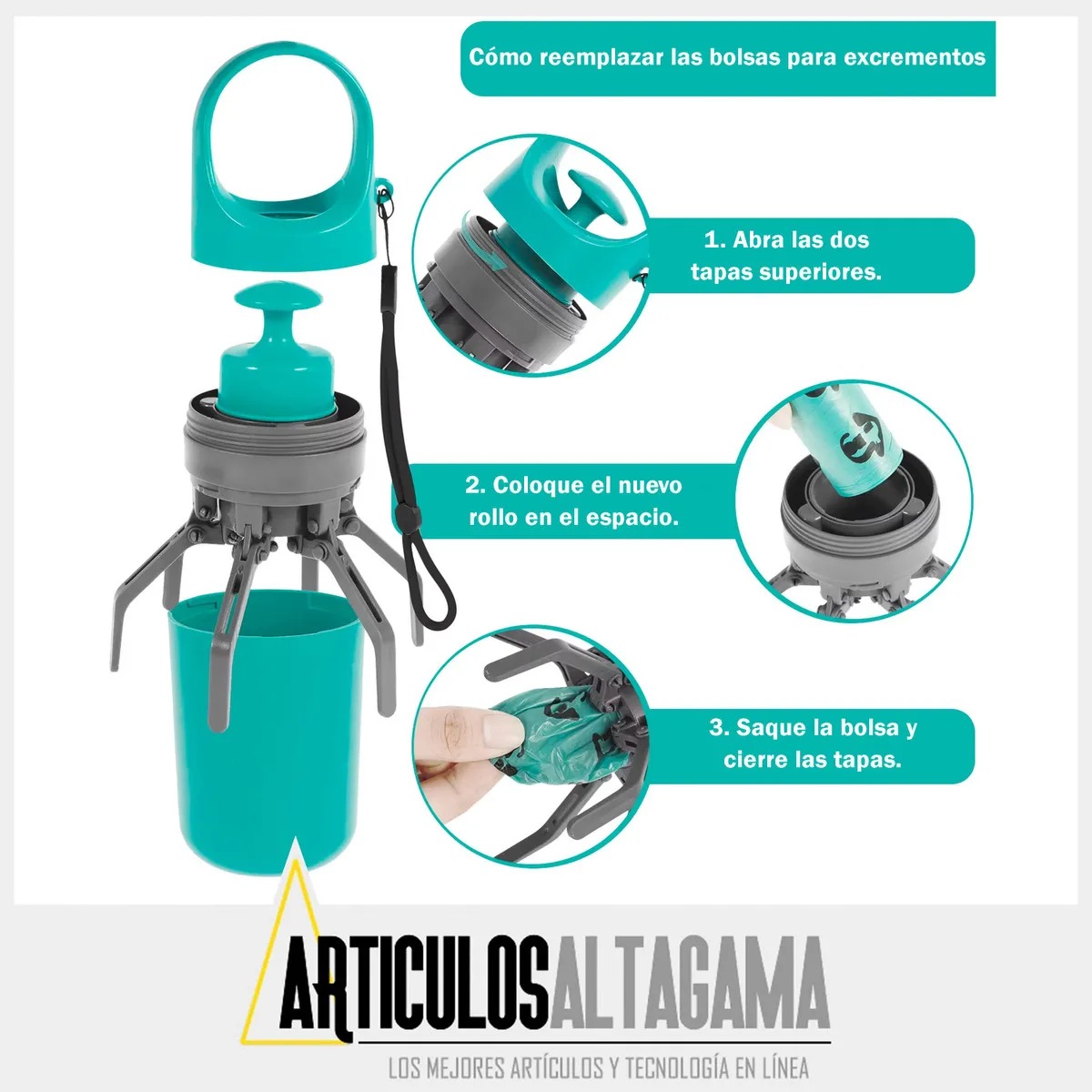 - 🛠️ Modo de uso: abre la pinza, coloca la bolsa, recoge el desecho y desecha la bolsa cerrada.